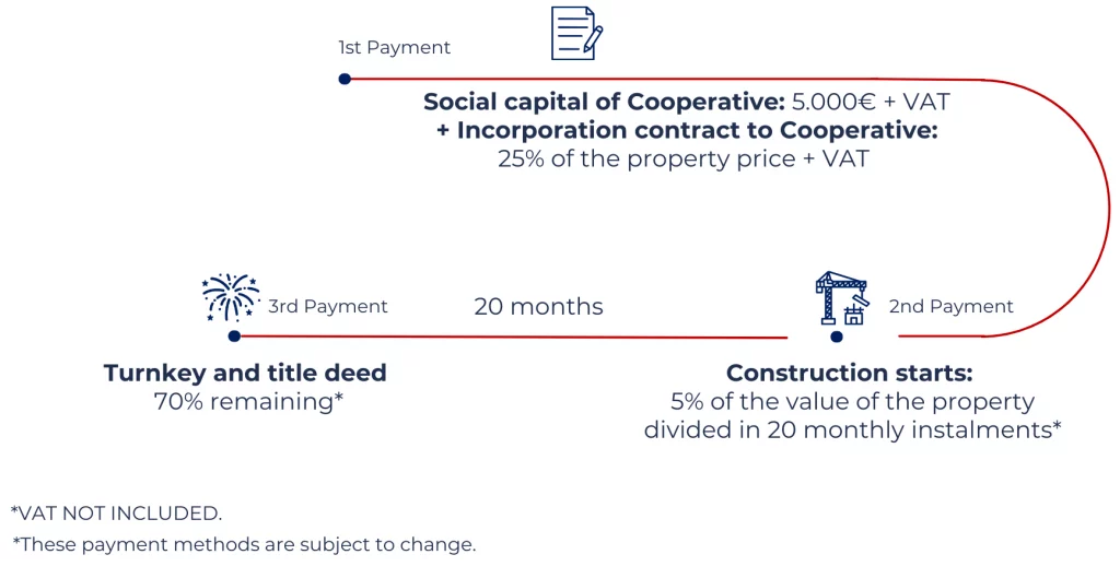1st payment is 5.500€ of social capital of the Cooperative + 25% of the property price + 10% VAT
